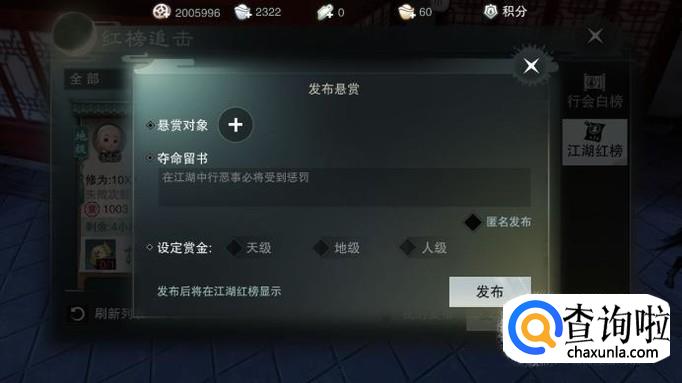 在发布悬赏界面,选择悬赏对象,填写夺命留书,并设定赏金的级别后,点击发布,等待暗影行当的玩家接取悬赏并击杀仇人即可。