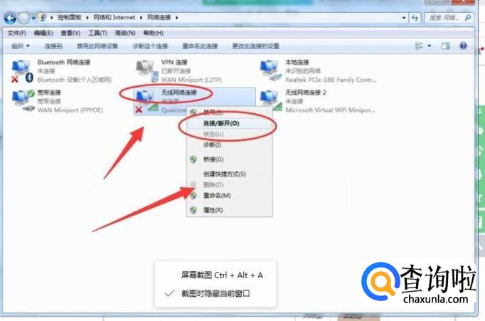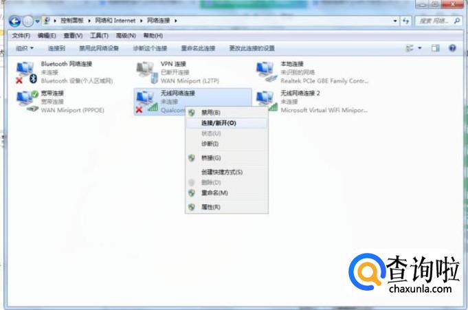 找到【无线网络连接】右击它,选择【连接】,如下图所示: