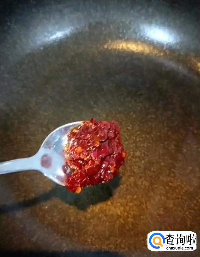 接着我们起锅烧油,放入适量的郫县豆瓣酱,再放入一块火锅底料,爆香