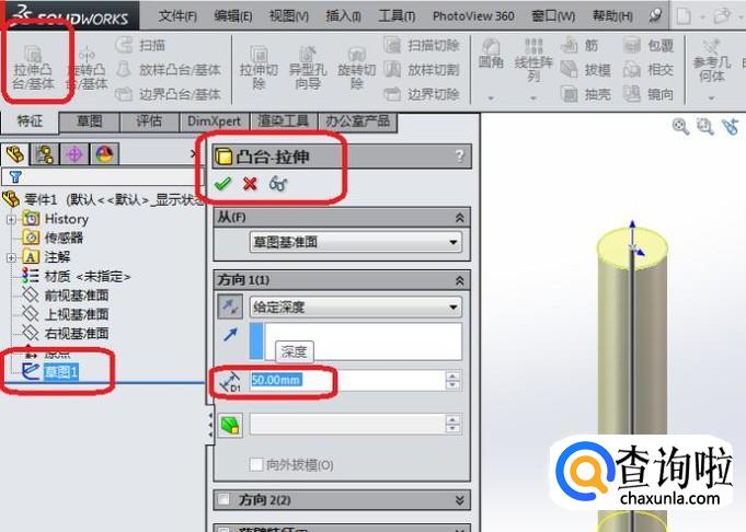 然后点击特征工具栏中的“拉伸凸台/基体”图标,