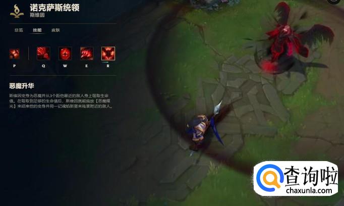 R技能是恶魔升华,乌鸦吸取附近3名敌方英雄的血量并治疗自身,从而对敌方英雄造成大量伤害