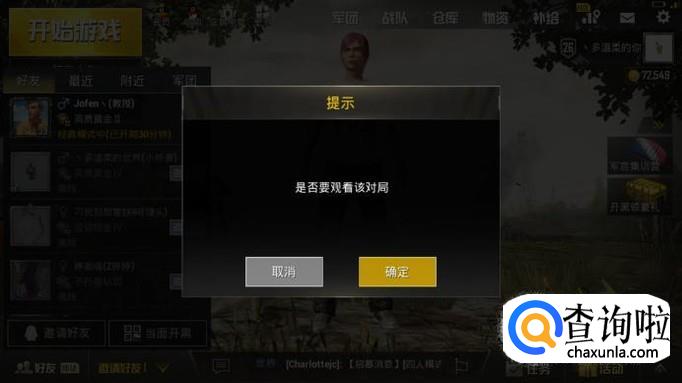 如果要观战自己的好友,那么点击游戏首页的下方的邀请好友,找到要观战的好友,如果他在玩游戏,就会出现一个观战的白色圆圈,点击之后,确认观战,就会进入观战的界面啦。