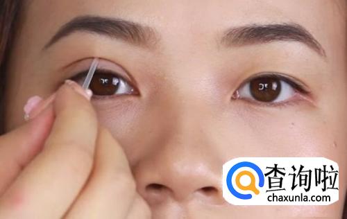用定位置的小叉子在眼皮上定好位置,然后留下叉子的痕迹做上胶的参考。一般位置双眼皮贴应该定在睫毛垂直向上3-5毫米的位置,如果是内双眼皮或者要做特殊效果的眼皮,可以根据自己的要求来定位。
