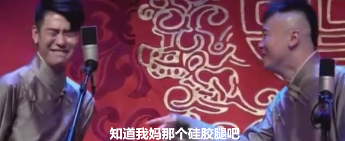 20181103期哈尔滨《栓娃娃》中,张云雷调侃杨九郎的妈妈有双硅胶做的假腿,杨九郎:“用错地方了吧,硅胶是用来做腿的吗?”,张云雷:“进口的”。