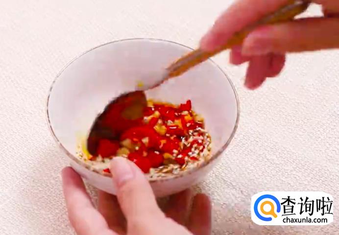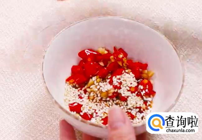 然后取一个新碗,加适量盐、蒜蓉剁椒酱、白糖、白芝麻、酱油、蚝油。