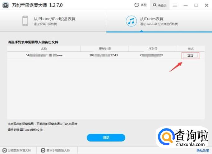 使用完iTunes备份完毕,在数据恢复软件界面上选择已经备份好的文件,点击“选定”进入下一页面。