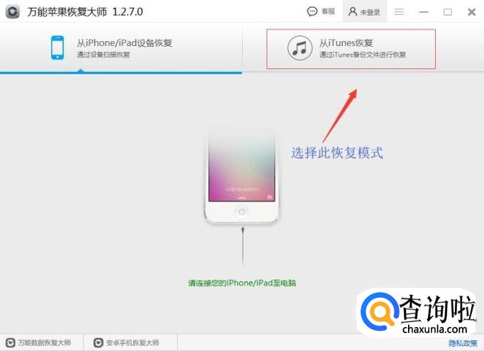 运行已经安装好的软件,在界面上上可以看到有“iPhone设备扫描恢复”和iTunes备份恢复。这里选择第二张恢复模式——iTunes备份恢复。