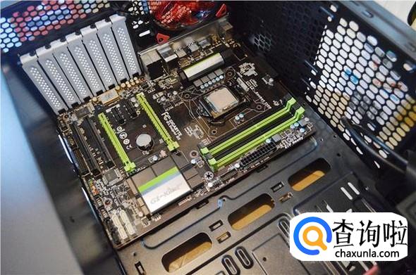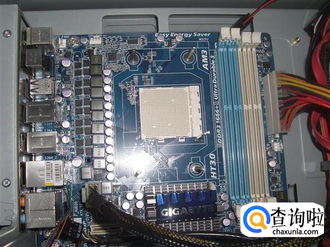 接着用尖型塑料卡对应着机箱上的圆孔,将主板固定在机箱底板上。
