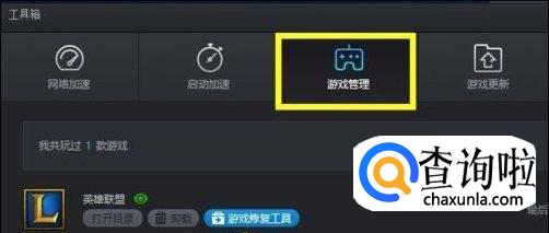 进入工具界面,点击上方的游戏管理,在工具列表中找到英雄联盟,点击其下方的打开修复工具。