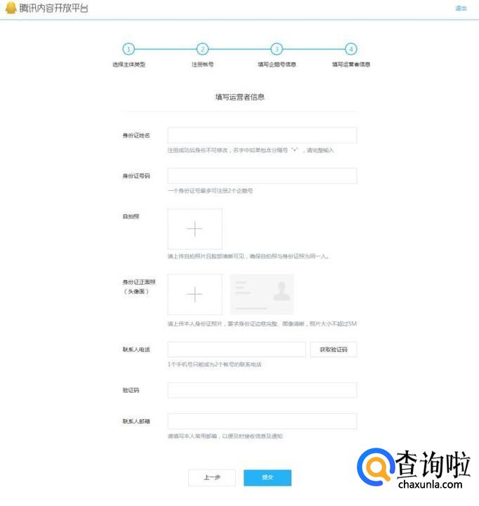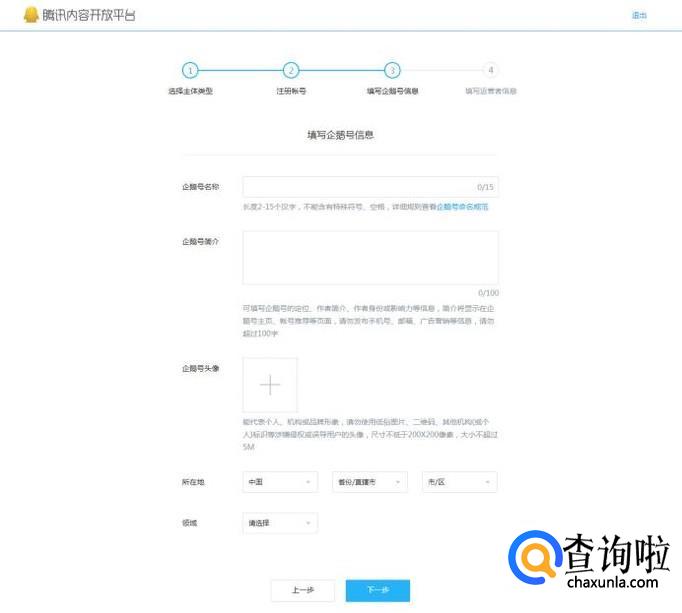 登录之后,输入准备注册的企鹅号的相关信息,如企鹅号名称、简介、头像、领域等信息,确定输入之后点击“下一步”。