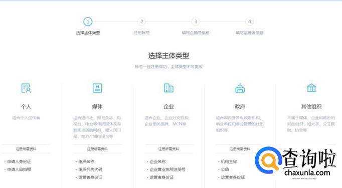 在注册的过程中,首先要确定主体类型,这里提供“个人”“媒体”“企业”“政府”“其他组织”等类型,注册之后就不能进行更改了。