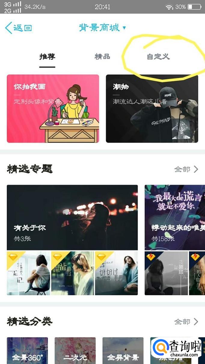 紧接着,大家点击自己此前的背景图片任何一处,点击进入以后,点击屏幕右上方的“自定义”