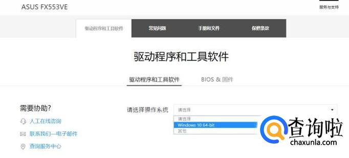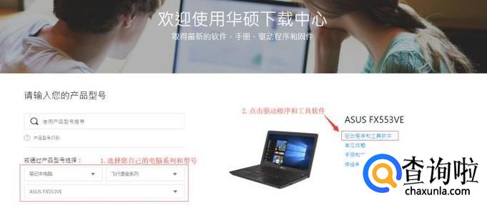 访问华硕ASUS官方网站,进入华硕ASUS的支持页面,如图选择自己华硕电脑的系列型号,再点击驱动程序和工具软件。(以下我们以飞行堡垒系列ASUS FX553VE型号为例)