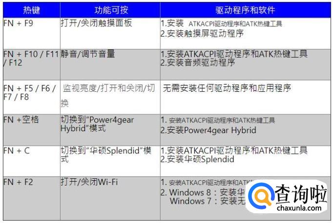 当华硕笔记本电脑的热键功能失效时,您可以通过华硕Live Update自动更新驱动程序及其应用程序,此外,您可以尝试下载最新的驱动程序和应用程序进行更新。如图表显示了常用热键的说明,以及需要下载和安装的驱动程序和应用程序。
