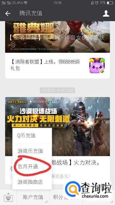 进入腾讯充值的公众号,然后找到菜单中的账户充值中的“包月开通”。如下图红色标注内容所示。