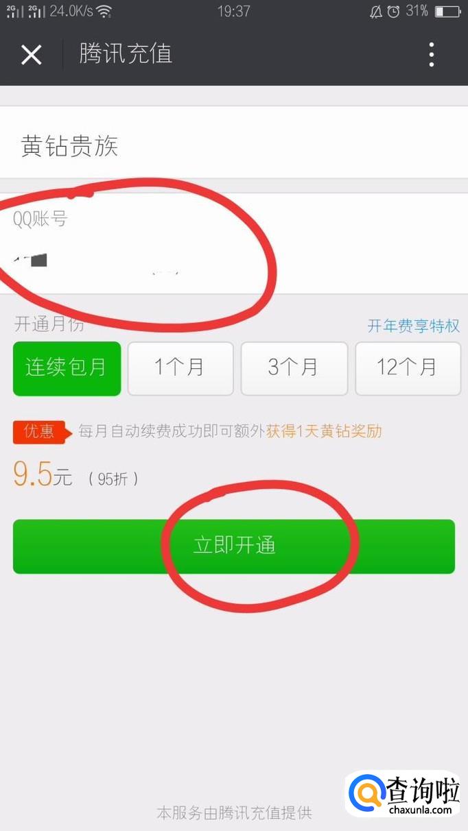 选择你想充值QQ黄钻的QQ账号,还有开通的月份,然后点击立即开通,就完成QQ黄钻开通设置了。