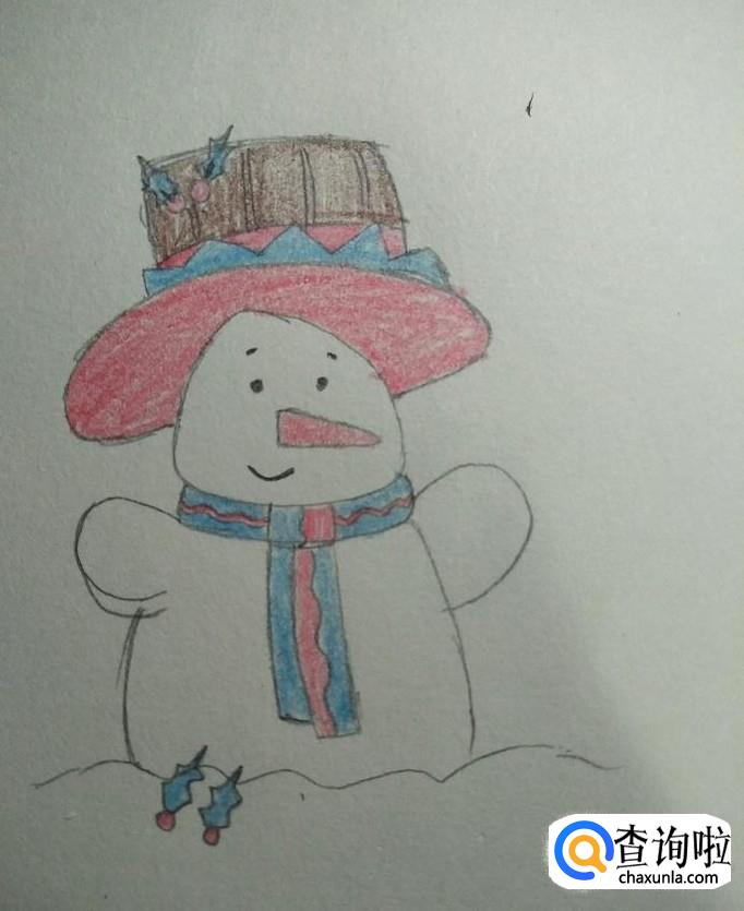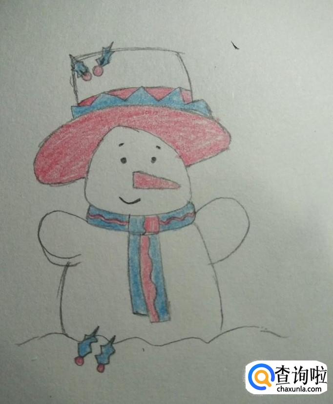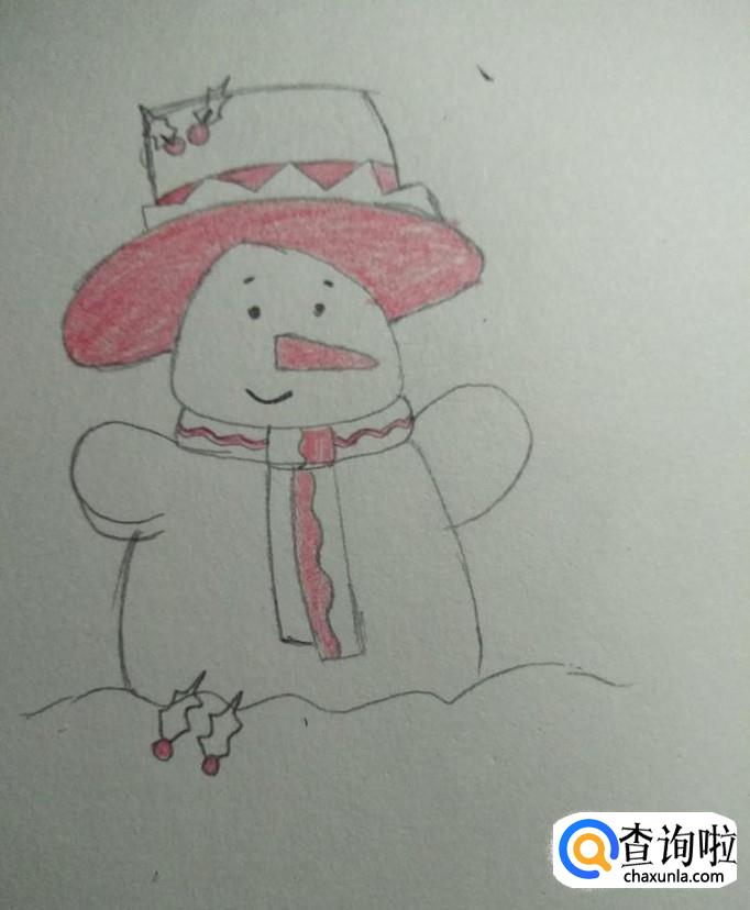 用红色蜡笔将其帽子,围巾的一些部分涂成红色