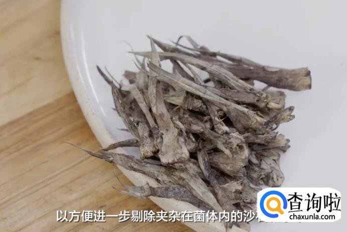 先用小刀削去表面泥土,摘净杂质,然后撕成小条,以方便进一步剔除夹杂在菌体内的沙石和杂草。