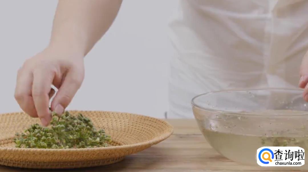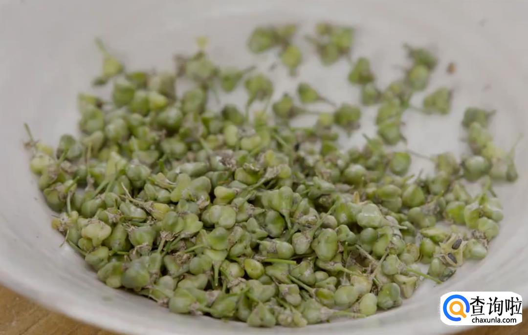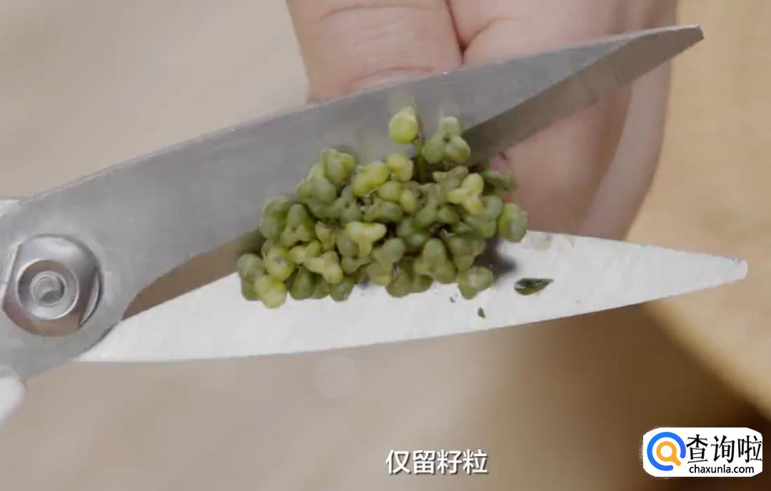 用剪刀减去韭菜花的老把,仅留籽粒。