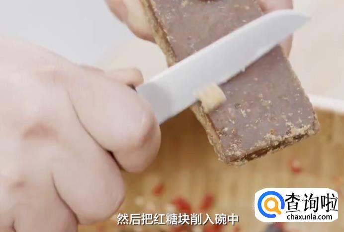 把红糖块用小刀削入碗中,拌匀后倒入韭菜花,用手充分抓匀。