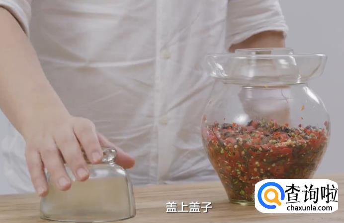 最后,将拌好的原料放入泡菜坛子,用勺子压平后盖上盖子;浇上纯净水,隔氧密封。
