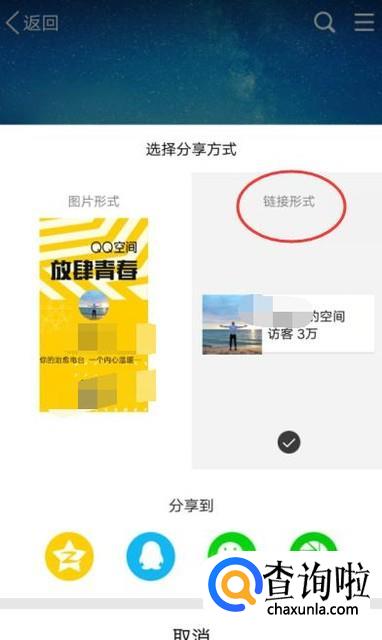 进入之后,选择“链接形式”,然后选择一种分享方式即可得到QQ空间链接,如图所示。