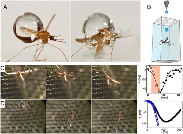 当雨水击中了蚊子的翅膀时,蚊子会向被击中的那个方向下沉,并且顺势旋转一周,将击中它的雨水摆脱,像一架战斗机一样翻转一周继续飞行。由于蚊子拥有强壮的外骨骼和轻量级的身形,当雨水击中了蚊子的身体时,雨水会包裹住蚊子在重力的作用下继续向下跌落,这个时候蚊子会立马调整自己的平衡,然后用一个水平的加速度迅速加速冲出雨滴。