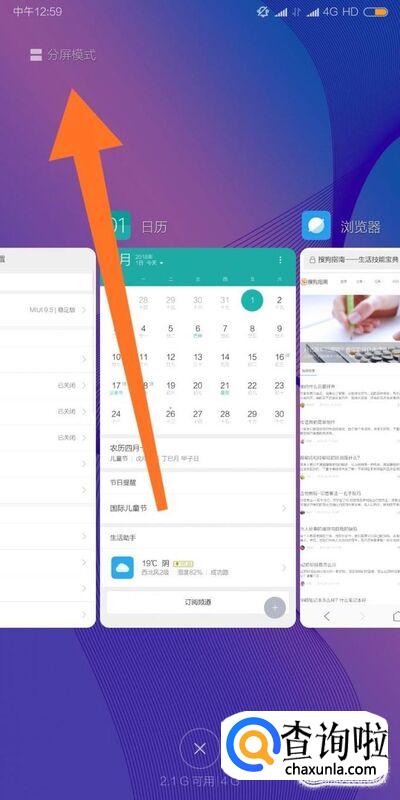 首先从手机桌面底部上滑,呼出多任务界面。然后点击进入左上角的“分屏模式”。