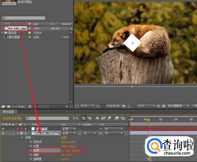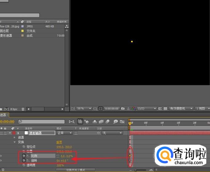 移动时间线指针到第一帧,为比例与旋转属性添加关键帧并按图示将其归零。