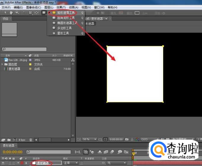 选择时间线的固态层,使用矩形遮罩工具在合成工作区绘制一个方形遮罩。