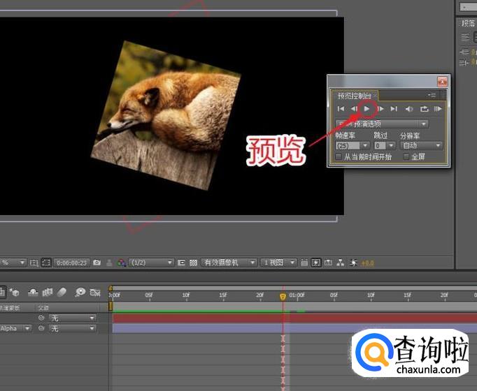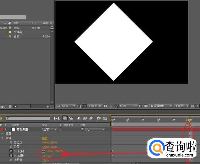 拖拽时间线指针到第一秒,调整比例与旋转的属性,使其产生旋转缩放动画。