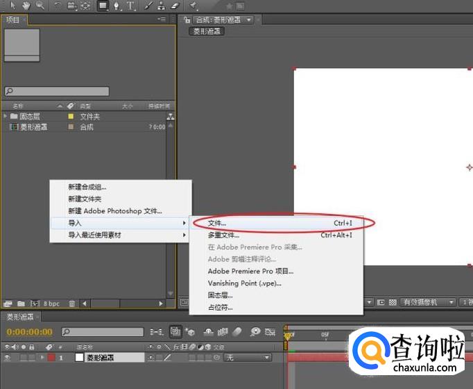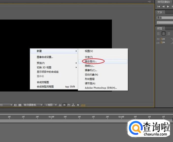 在合成面板的空白区域,右击鼠标选择“新建>固态层”选项,快速的建立一个固态层。