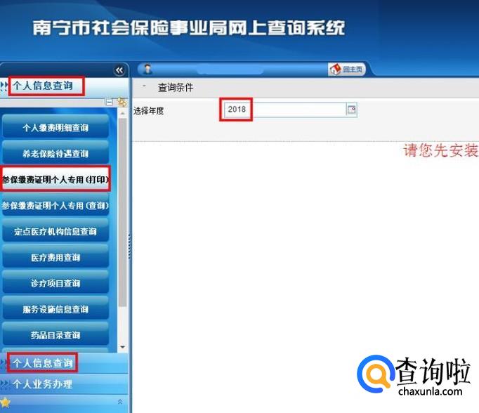 进入到系统页面,可以看到个人信息查询栏有“参保缴费证明个人专用(打印)”,选择该选项,再选择年度,点击右边的查询按钮之前,确保已安装PDF阅读器,不过一般浏览器会支持的;