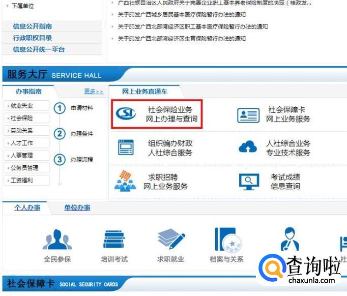 在网页中部“服务大厅”一栏有“社会保险业务网上办理与查询”,这是办理社保网上业务的主要入口;