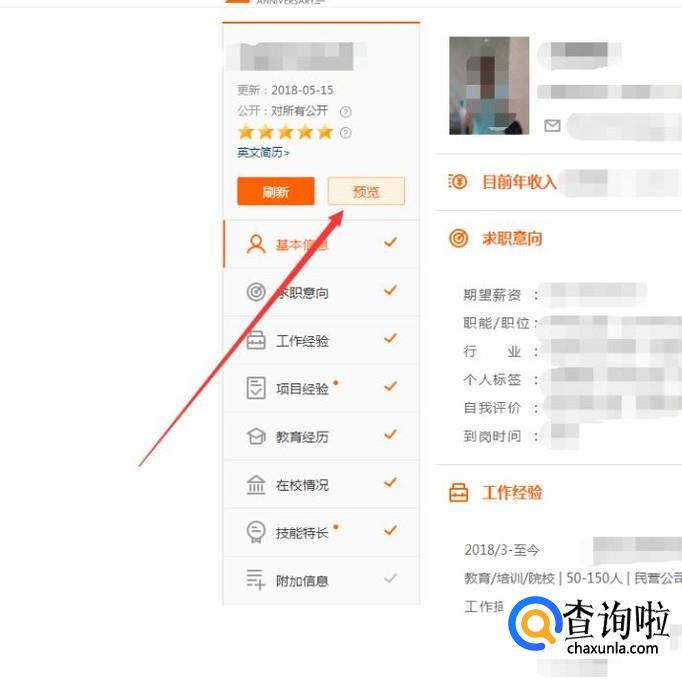 我们打开简历,在简历的左边会看到一个“预览”选项按钮,我们从这个按钮处点击进去,可以查看整个简历。