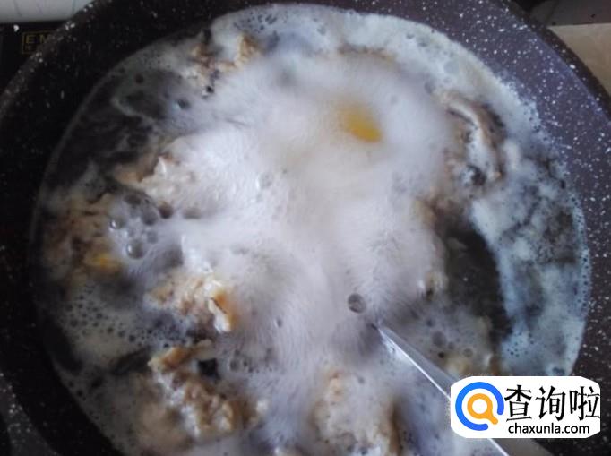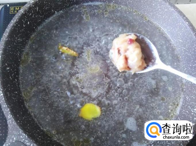 再用小勺把鱼饼装到锅里。