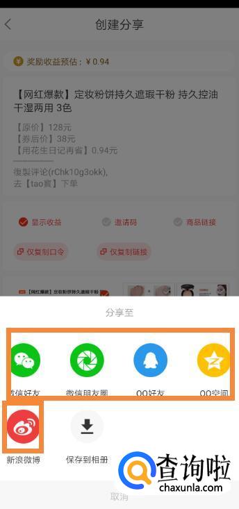 这里以分享图片为例,点击“分享图片”后,可以选择分享方式。不管是哪种分享方式,只要朋友通过我们的分享扫码购买了该款产品,我们都能获取对应的佣金。