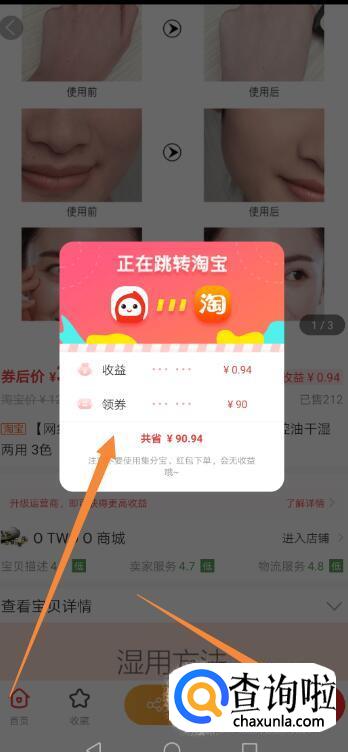 授权结束后,继续点击“领劵”按钮,可以看到页面中正在跳转淘宝的提示,以及该订单的佣金收益和优惠劵数目。