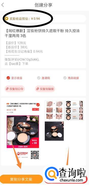 分享页面我们可以看到可以赚取的佣金以及分享方式,可以选择“复制分享文案”,也可以选择“分享图片”。