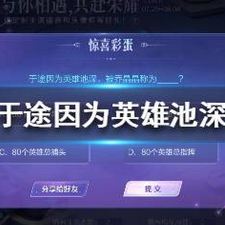 于途因为英雄池深,被乔晶晶称为80个英雄总教头。《与你相遇,共赴荣耀》活动中玩家在操纵棋子移动过程中有机率触发彩蛋事件,可通过答题的方式完成彩蛋,答题成功后可获得额外步数奖励。