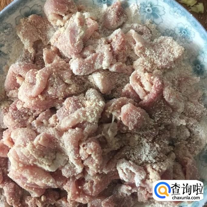 接着将瘦肉切成薄片并用适量的地瓜粉裹一下,如下图所示。