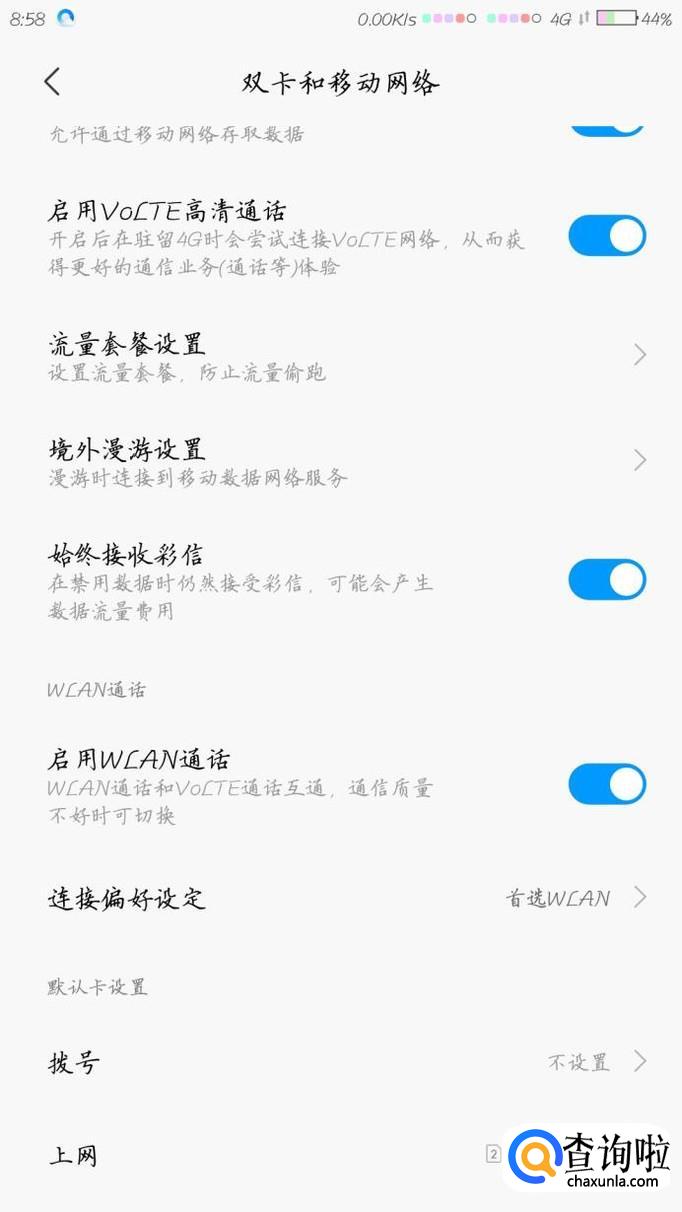 接下来就是双卡设置的界面了,这里还有关于视频通话的选项,我们拉到最下面。