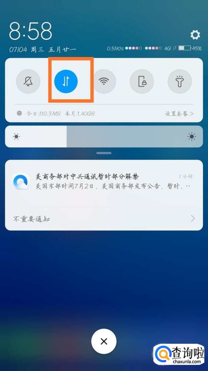 我们接下来就是设置移动流量的卡了,设置可以很好的避免一张卡的流量超出,首先拉下状态栏,找到数据流量的图标,然后长按。