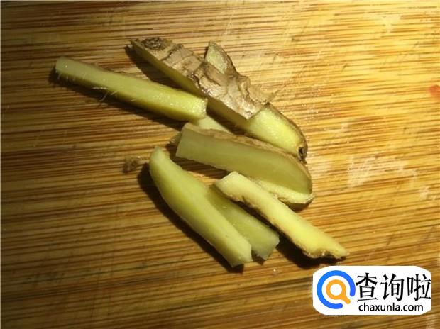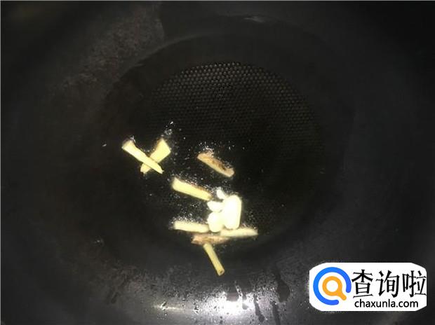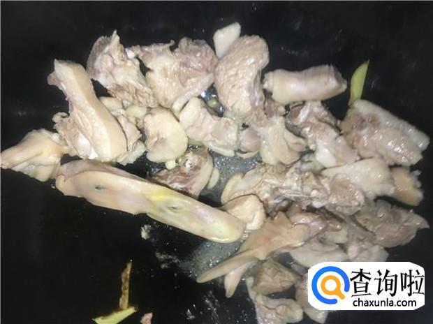 热锅下油,放入姜丝煸香,然后倒入鸭肉,加入少许酱油和蚝油,翻炒鸭肉。