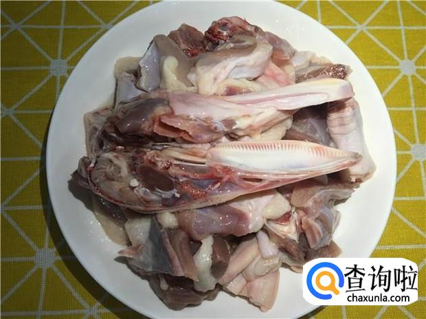 鸭肉切小块,清洗干净,鸭头的位置一定要切开,多清洗几遍,把黏黏的唾液给清洗干净。