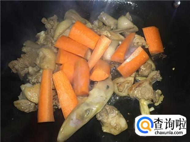 鸭肉大概炒五分钟左右,再把红萝卜一起倒入锅中,翻炒均匀,加入适量的清水,盖上锅盖大火焖。