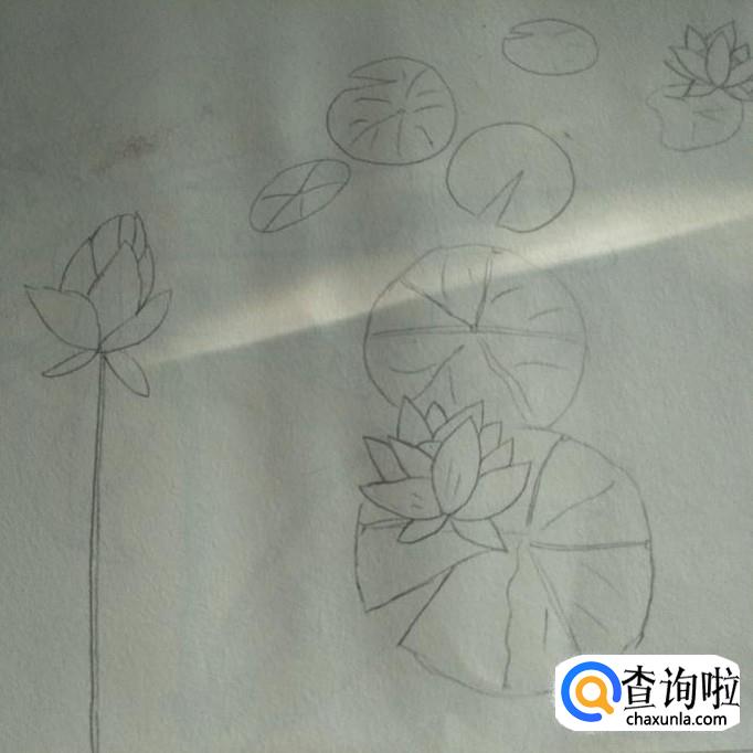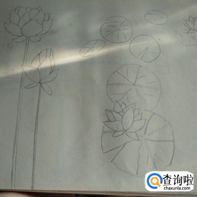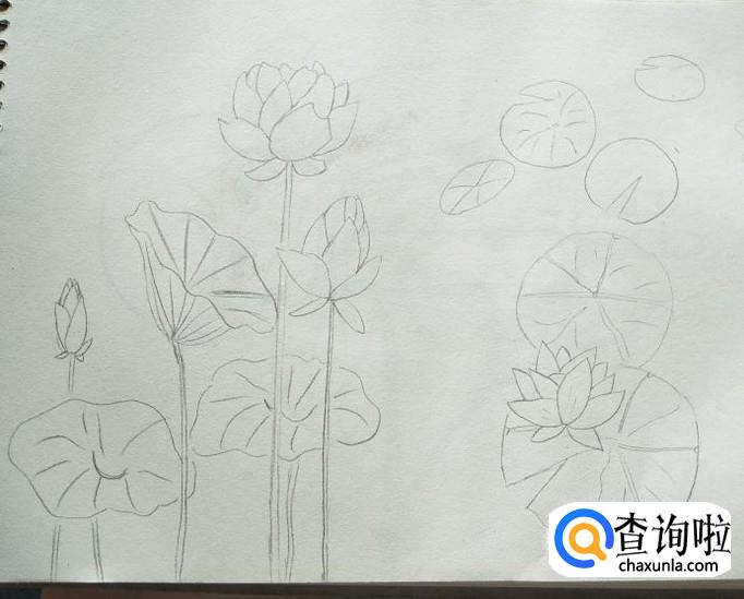 然后,在其上方再画出一些莲叶,越往里面画叶子越小同时也越扁,营造一种在岸上看花的视觉感,最后,在素描本的右上端再画出一朵莲花,一片花下的莲叶