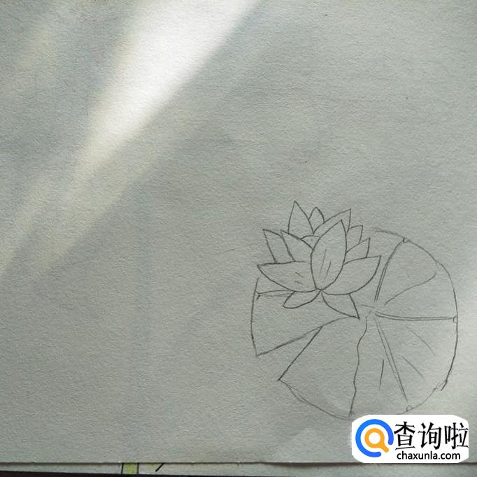 然后,我们在莲花的下面画出一片莲叶,如下图所示,莲花稍微要靠边一点,莲叶上面有一个缺口,这样子看起来比较的真实有意境好感,也会有一种莲花席莲叶而坐的感觉