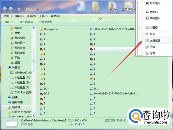 来到回收站页面,我们可以看到很多删除的文件,这时候我们再点击排列方式,选择详细信息