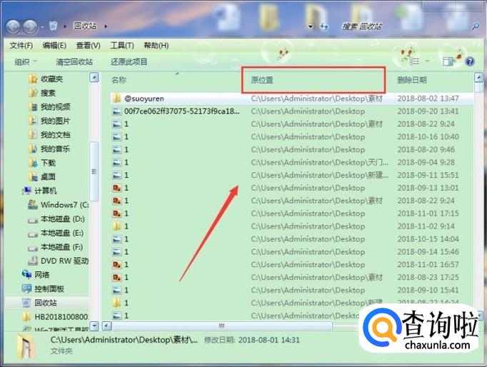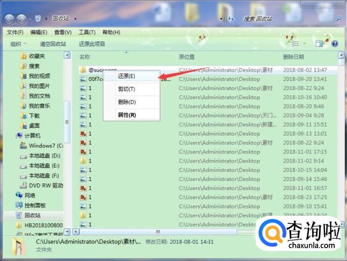 这样就可以很方便看到该文件的详细信息,可以帮助我们快速找到删除的文件。如果我们想要还原文件,直接选中该文件,单击右键,选择还原即可